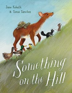 “In Kohuth and Sánchez’s seasonal work, friendly forest creatures march to the top of a hill, where they all sense a “Something” taking root in winter’s aftermath. Field Mouse, first to awaken from an icy slumber, intuits a change: “Something was out there, calling to her. Something on the Hill.” As she ventures forth, she’s soon joined by Gray Squirrel, Doe, and aged Turtle, who indicates that the hillside mystery “goes like this each year.” The intrepid band expands with the addition of some ducks and a bear family, until the whole crew arrives at the summit, discovering the “Something”: spring’s harbinger. Handmade brushes and textures lend digital renderings a smudgy quality in images that gradually shift from a wintry palette to one with yellow and green undertones. The result is a jubilant tribute to creaturely instincts as well as bonds that endure seasonal transitions.” —Publishers Weekly